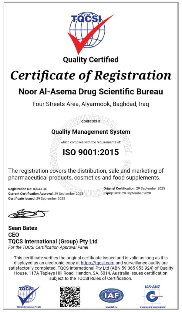 We are proud to be certified with ISO 9001:2015 for our Quality Management System. This certification reflects our commitment to excellence in the distribution, sale, and marketing of pharmaceutical products, cosmetics, and food supplements.