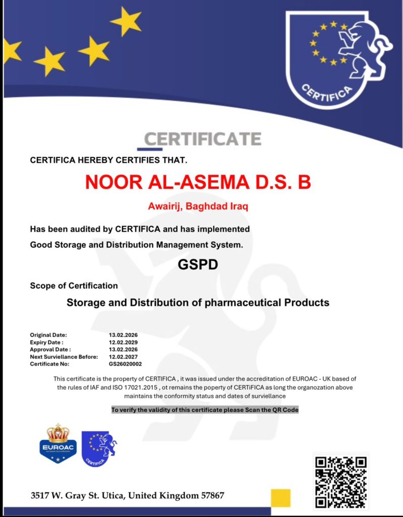 We are proud to receive the GSPD (Good Storage and Distribution Practice) certification. This achievement reflects our commitment to the highest standards in pharmaceutical storage and distribution.